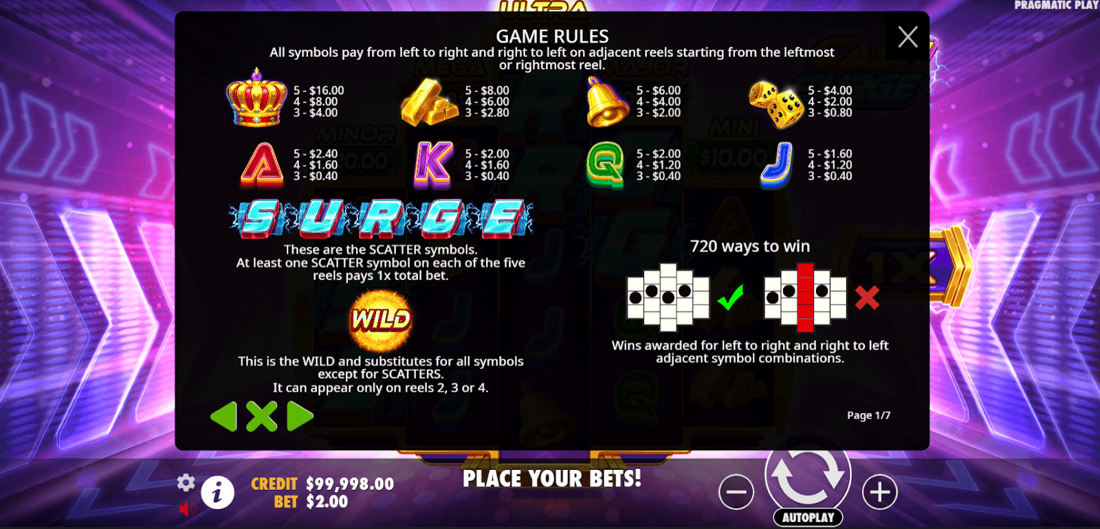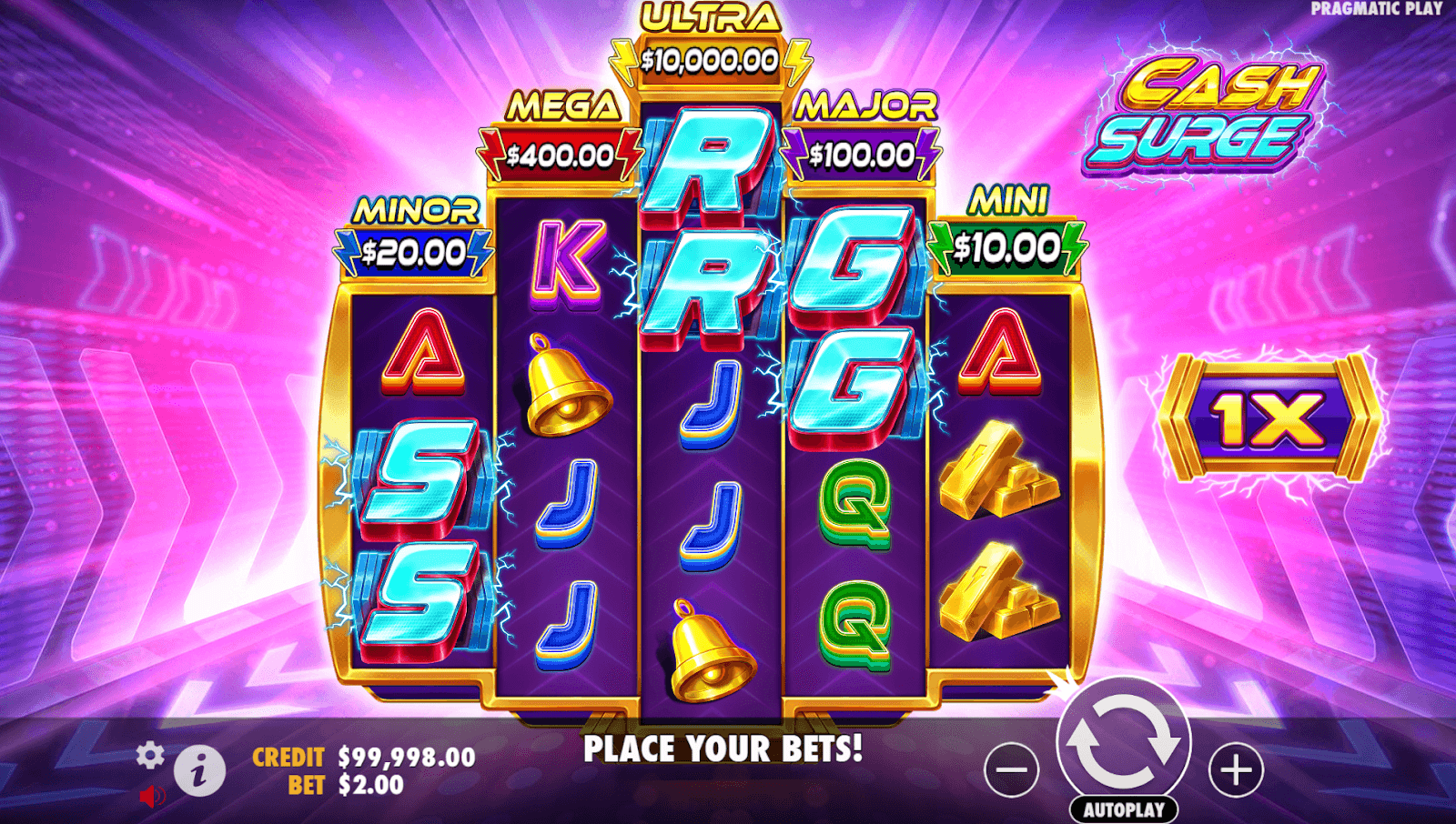 Scatter písmena se drží, dokud nevyhlásknete SURGE, čímž spustíte čtyři roztočení zdarma. Nová písmena přidávají otočení a blesk může stále narazit nebo udělit progresivní odměnu - což umožňuje cenu 5 000 × Ultra v jediném zapu. Bez Feature Buy je klíčová trpělivost a správa bankrollu; mnoho hráčů staví progresivní hry v základní hře ještě před výbuchem.